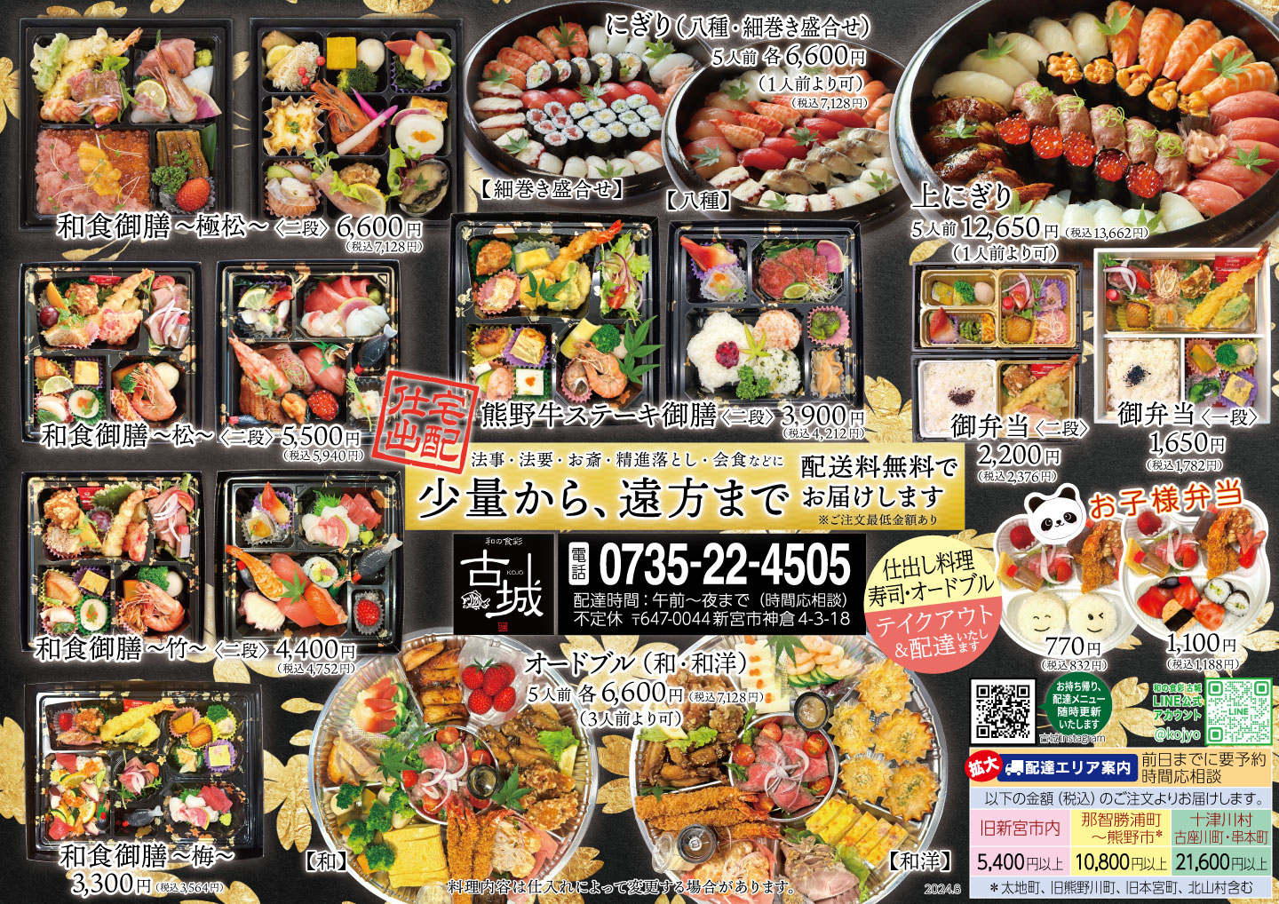 ご法要、お祝い等の仕出し料理を少量より配達させていただきます。配達範囲は新宮市内~勝浦町~熊野市~本宮町~十津川村までの区間。