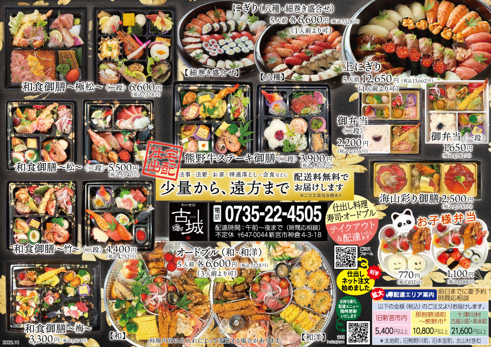 ご法要、お祝い等の仕出し料理を少量より配達させていただきます。配達範囲は新宮市内~勝浦町~串本町~熊野市~本宮町~十津川村までの区間。